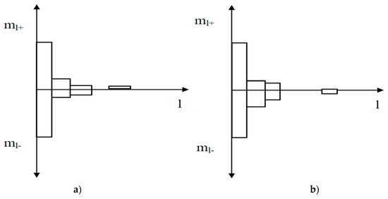 For the same threshold, the minimum deviation of the joint theoretical and empirical distributions Δ = 0.007 was obtained, which confirms this independence. Figure 8 shows one-dimensional histograms for l+ and l− characteristics and Figure 9 shows the corresponding two-dimensional histograms for the l+ and l− characteristics.