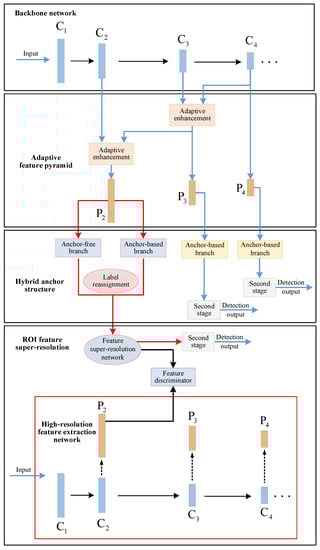 Following the two-stage detection pipeline, the overall framework of our method is shown in Figure 1 and consists of four parts: backbone network, adaptive feature pyramid, hybrid anchor detection structure, and RoI feature super-resolution.