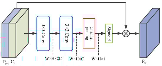 The structure of the adaptive enhancement module is shown in Figure 3. The input feature maps and are both in size. First, and (i = 2, 3, 4) are spliced along the channel, and a convolutional layer is set for channel fusion to obtain the size output feature map. Then, channel reduction is performed through a convolutional layer to halve the number of channels. Next, a spatial weight map of size is obtained via channel average pooling and sigmoid activation function. Finally, the spatial weight map is used to weight to get the enhanced feature . The adaptive enhancement module predicts the fusion weight for each location of high-level features according to the feature map to be fused. In this way, features of important locations are enhanced while features of irrelevant locations are ignored, thereby achieving better feature fusion.