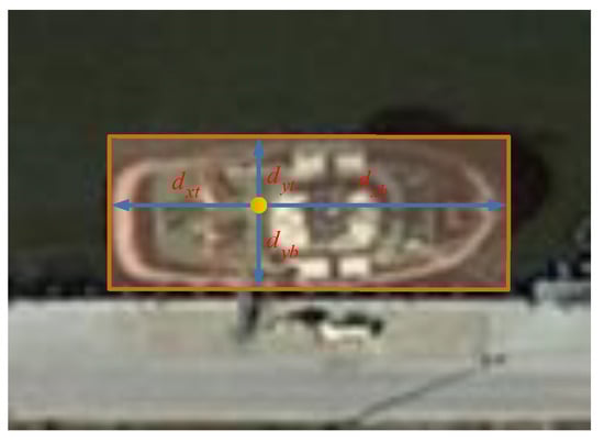 In order to better detect small ships, we set an anchor-free detection branch at the layer. Different from the anchor-based branch, the anchor-free branch does not need to predefine the width and height of the bounding box, and it directly regresses the distance from the current location to the four sides of the object bounding box. Assuming that the coordinates of the top left corner and the bottom right corner of the object bounding box are and , respectively, and the coordinates corresponding to the current location are . Then, as shown in Figure 4, the offset predicted by the anchor-free branch is .