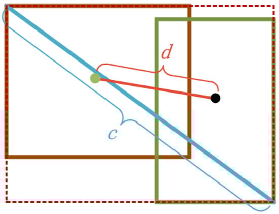 where represents the square of the distance between the predicted box and the center point of the ground-truth bounding box, and c represents the diagonal length of the combined rectangle composed of the predicted box and the ground-truth bounding box, as shown in the Figure 5.