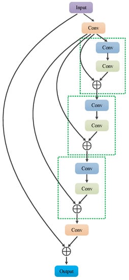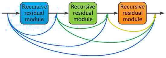The structure of the recursive residual module is shown in Figure 6, in which the two consecutive size convolutional layers in the green dashed boxes are the basic convolutional units. To limit the growth of parameters, the parameters are fully shared between basic convolutional units. The recursive residual module consists of a basic convolution unit and a recursive residual structure, which recursively calls the basic convolution unit to calculate the residual output. Compared with an ordinary residual module, the recursive residual module increases the depth of the network without increasing the number of learnable parameters, so it has less risk of overfitting.