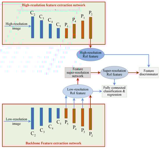 Similarly, for the object detection task, Li et al. [] use a generative adversarial network to perform feature super-resolution on the RoI (region of interest) features of small objects, transferring shallow features to deep features through the residual structure to supplement detail information for small objects. Compared with image super-resolution, RoI feature super-resolution is closer to target discrimination and can achieve computational sharing to the greatest extent, thereby reducing the amount of computation. However, this method only uses the shallow features of the small object for feature enhancement without real high-resolution features as supervision. Therefore, the obtained results cannot reflect the real details well.