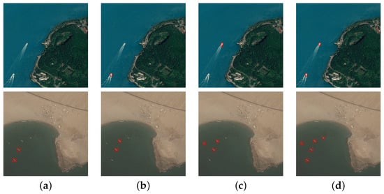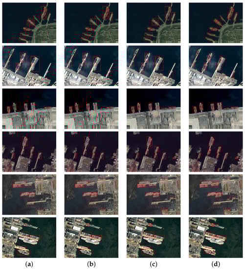Detection results of small ships with different algorithms: (a) method from []; (b) method from []; (c) Libra R-CNN; (d) our method.