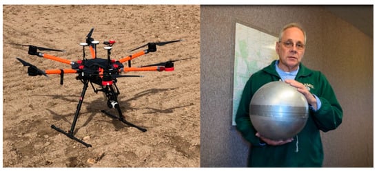 (left) Picture of DJI Matrice 600 Pro UAV; (right) The metal sphere used for the calibration experiment.