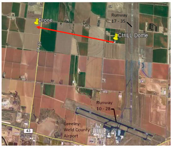 As seen in Figure 3, the location of the D3R was very close to the Greeley-Weld County airport in Colorado, USA. There are a large number of restrictions on flying a UAV this close to the airport, so the appropriate permissions were obtained for this drone experiment from the airport authorities. The UAV was flown at an altitude of 121 m from the ground to avoid increased regulatory complications from the Federal Aviation Administration (FAA). This is another factor which needs to be considered when performing a calibration experiment using a UAV. Because the calibration experiment was carried out close to the airport it involved prior permission and paperwork which took a few days for processing, that should be considered when designing the experiment.