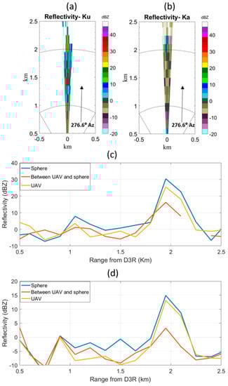 Figure 6a,b show a PPI of the raster scan Ku and Ka data, respectively, for the peak reflectivity corresponding to the sphere. We can see from this figure that there is a clear peak of reflectivity value in the resolution volume where the sphere was present. Figure 6c,d show the line plot of reflectivity at 276.6 degree azimuth considered for the scan, this corresponds to the line of sight of the UAV, sphere, and the region between the UAV and the sphere. From these two plots, it can be seen that the reflectivity values peak when the radar resolution volume has the sphere or the UAV, but drops in the region between them. This shows that separating the UAV and the sphere will yield correct computations of the calibration with respect to the sphere.