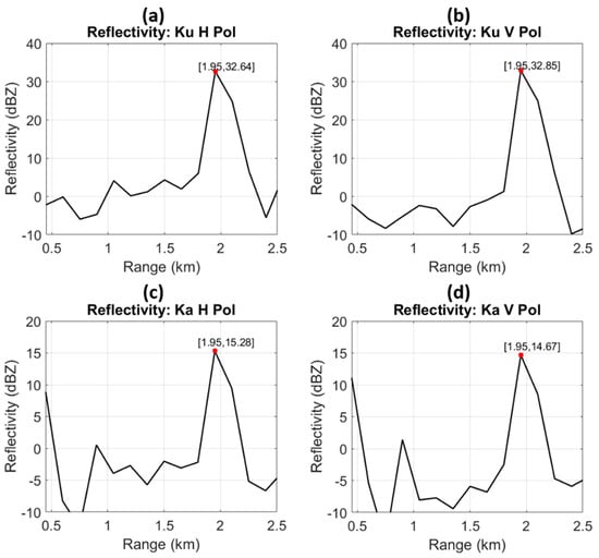 Peak reflectivity values corresponding to the metal spheres used for calibration, the sphere is located at 1.95 km from the radar. (a) Ku H pol data; (b) Ku V pol data; (c) Ka H pol data; and (d) Ka V pol data.