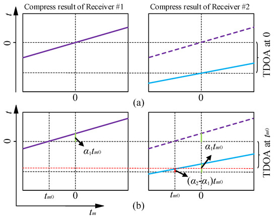 where = . As the TOA of each receiver is time-varying during the movement of the receivers, the TDOA is also time-varying. represents the TDOA offset from the zero time. Figure 3a shows that one can obtain the TODA at the central time by setting tm0 = 0. Figure 3b shows that if the parameter tm0 in the reference pulse is not zero, the compressed result is shifted by time α1tm0 relative to Figure 3a. At tm0, the offset of the TDOA is (α2 − α1)tm0. Thus, the TDOA at different times can be obtained by selecting reference pulses at different times.