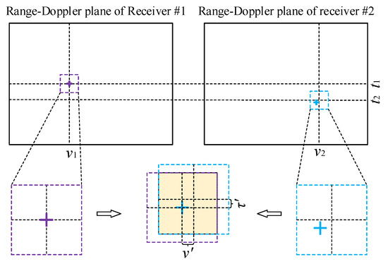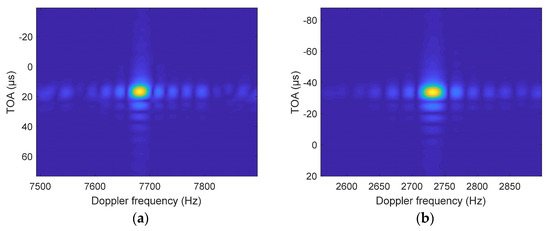 where tr is the range time [36,37], and t1 is the time of arrival (TOA) of Receiver #1. The signal received by Receiver #2 is similar to (4), except that the Doppler factor and TOA differ.
