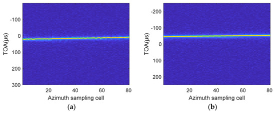 Different from the former method, (28) maintains the TOA of each receiver, which means the true TOA of each receiver can be obtained. Equation (28) also suffers a coupling of range frequency and azimuth time. To handle the coupling, we use the modified Keystone transformation and set tm0 = 0. Then, phase is replaced with . After the transformation, one obtains