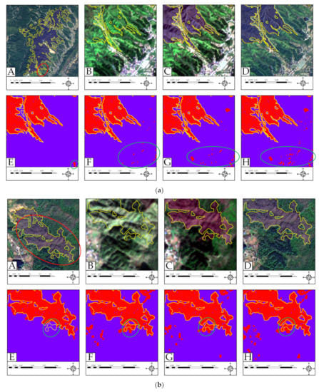 To further assess the performance of the proposed BASM method, we evaluated it quantitatively at the fifteen fire-scar sites using the Sentinel 2 satellite images. As in Section 4.2, we took two fire-scar sites in Hendong County (i.e., 1HYHD) with 1244.42 ha burned area and Sangzhi County (i.e., 11ZJJSZ) with 34.72 ha burned area.