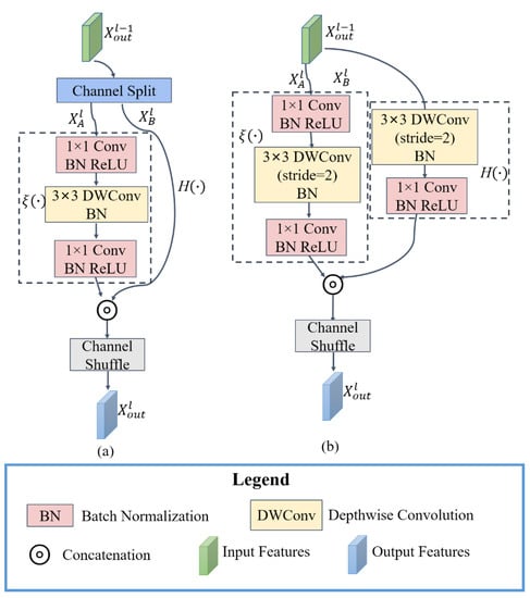 To maintain the spatial resolution of feature maps (stride = 1), as shown in Figure 2a, the left branch represents the identity function and the right branch is cascaded by three convolution layers. Among them, the 3 × 3 convolution layer uses depthwise convolution. To double-downsample in the spatial dimension (stride = 2), as shown in Figure 2b, , and the left branch is a depthwise separable convolution, modeled sequentially by 3 × 3 and 1 × 1 convolution layers. The 3 × 3 convolution layer uses depthwise convolution and the stride is 2. The right branch is also cascaded by three convolution layers, where the 3 × 3 convolution layer is a depthwise convolution and the stride is 2. The channel dimension of the feature is doubled after the base block of stride 2, and the spatial resolution becomes one-half of the original. Batch normalization (BN) and ReLU activation function are cascaded after the 1×1 convolution layer to improve the stability of model training; only the BN layer is cascaded after the 3 × 3 convolution layer, and there is no activation function layer to reduce computational costs. BN can accelerate the training by reducing internal covariate shift [38], and ReLU can avoid the gradient disappearance and alleviate overfitting [39].