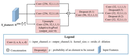 As shown in Figure 1, the classifier of the Shuffle-CDNet consists mainly of Layer 3 and Layer 4. The input feature of the classifier is obtained by contacting ,, and in the channel dimension. For the high-dimensional features obtained after contact, a CAM module is introduced. The implementation details are introduced in Section 2.3. Then, the channel dimension of is reduced from 512 to 256 by a 1 × 1 convolution layer to further reduce the computational costs for the subsequent network. The Light-ASPP module is based on ASPP in the Deeplabv3 series [40]. It takes into account the different scales of changed regions and reduces the computational costs. The architecture of the Light-ASPP module is shown in Figure 3.