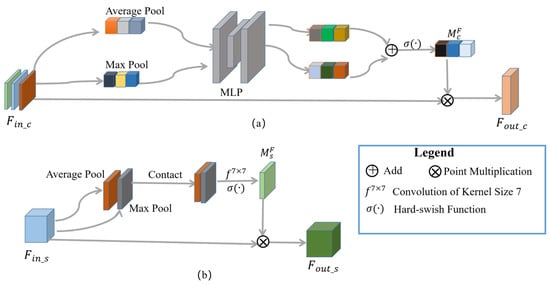 represents the input feature, AvgPool (∙) represents average pooling, MaxPool (∙) represents maximum pooling, MLP represents multilayer perceptron, and represents the hard_swish activation function. Suppose , then the dimension of is , assigning weights to each channel. The CAM is shown in Figure 4a, which is mainly divided into two steps: (1) aggregating the information of each channel and calculating the channel attention distribution of the features, that is, ; (2) combining with the original feature . The module is used after contacting , , and to enhance the discriminative ability of features.