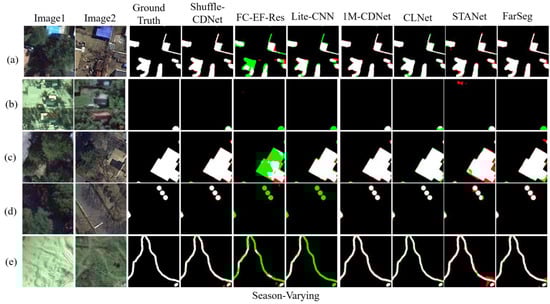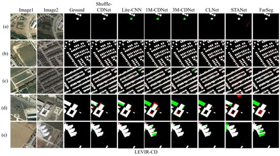 For visual comparison, Figure 5 shows the detection results on the LEVIR-CD test sets. Black, white, red, and green pixels represent TN, TP, FP, and FN, respectively. It can be seen that Shuffle-CDNet can reduce missing detection of small changed objects, mainly due to the edge-information feature-enhancement module. For example, in Figure 5a–c, Shuffle-CDNet is clearly improved with regard to the missed detection phenomenon of small objects compared with other CNN-based networks such as Lite-CNN and 1M-CDNet. Attention-based networks such as STANet and FarSeg, as well as CLNet, take contextual information into account and perform well in small-object detection. However, for the detection of large-range changed areas, as shown in Figure 5d,e, Shuffle-CDNet can generate a change map with better changed regional internal compactness compared to other networks including 3M-CDNet. It can be seen that the qualitative results are consistent with the analysis of the quantitative results, and Shuffle-CDNet performs better than other advanced networks on the LEVIR-CD dataset.