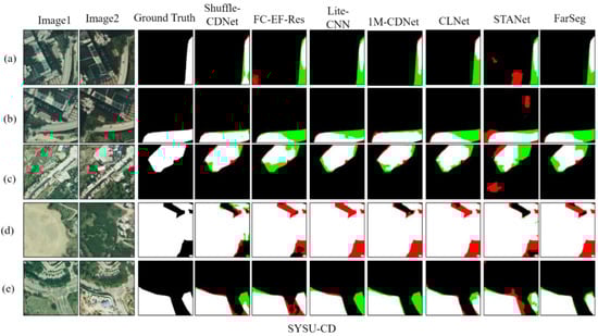 Results on the SYSU-CD test sets. Different colors are used for a better view, i.e., white for true positive, black for true negative, red for false positive, and green for false negative. (a–e) are results of five pairs of bitemporal images.