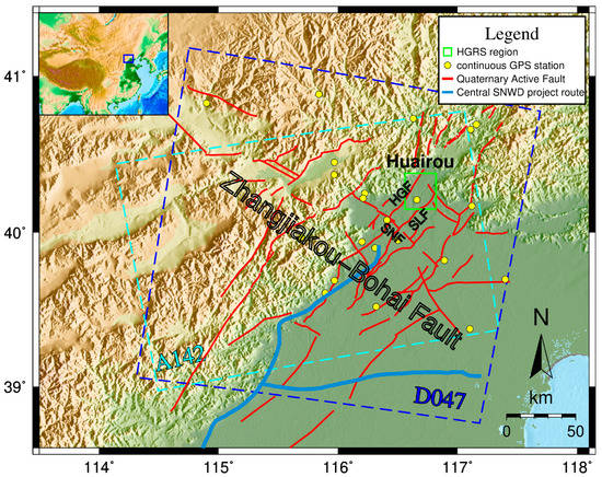 Tectonic settings of the Beijing area. The dashed boxes show the InSAR data coverage of the study region, cyan for ascending track 142 and dark blue for descending track 47. The red lines mark the quaternary active faults, the northwest trending ones are from the Zhangjiakou-Bohai Fault Zone (ZBFZ), including Sunhe–Nankou fault (SNF), Huangzhuang–Gaoliying fault (HGF), and Shunyi–Liangxiang fault (SLF). The light blue lines show the central route of the South-North Water Diversion (SNWD) Project. Part of the water is transferred through and recharged in the Huairou groundwater reserve site (HGRS) region, which is outlined by the green curve. The yellow circles are the locations of continuous GPS stations in the study region, which are used as a reference in the InSAR data processing.