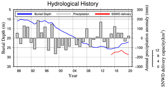 The historical precipitation (grey histogram) and hydraulic burial depth (blue line) records of the Beijing area [3]. The red line shows the water volume delivered to the Beijing area by the SNWD Project each year since 2015.