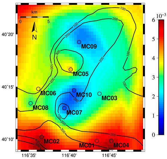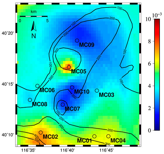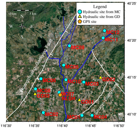 To consider the contribution of water storage change in the unconfined aquifer to the effective stress change, we followed Equation (6), again not considering the vertical deformation caused by the mass loading effect, to estimate the storativity . To do so, the observed water level data in the unconfined aquifer are essential. Five sites in the HGRS region have water level observations from wells in both confined and unconfined aquifers (MC01-MC05). The porosity of the unconfined aquifer is 0.21, which is based on the hydraulic study of the sediment layer of the NCP [47]. The corresponding storativity values range from to at the five sites (Table S2).