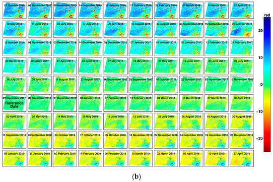 (a) Unwrapped phase time series for ascending track 142 after atmospheric correction. (b) Unwrapped phase time series for descending track 47 after atmospheric correction.