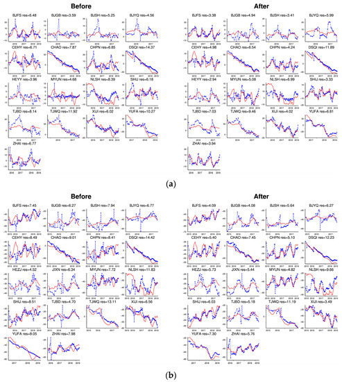 (a) Time series comparison at continuous GPS stations in ascending track 142. Blue points are InSAR time series and red lines are GPS time series, which are projected in the LOS direction. The left and right panels are the results before and after offset correction, respectively. (b) The same as Figure 6a but for the descending track 47.