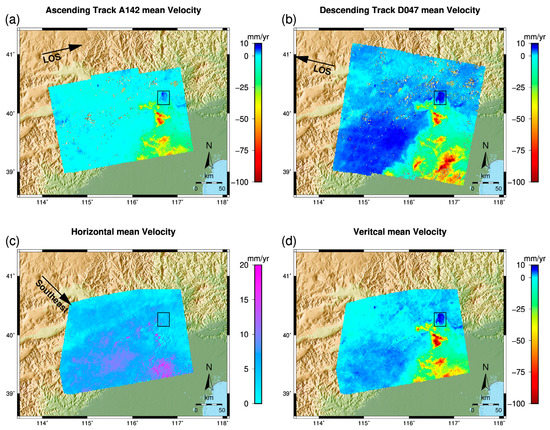InSAR data results. (a,b) InSAR A142 and D047 mean LOS velocities. (c,d) Horizontal and vertical mean velocities resolved by considering only the southeastern and vertical components of the displacement field. Black rectangle marks the HGRS region.