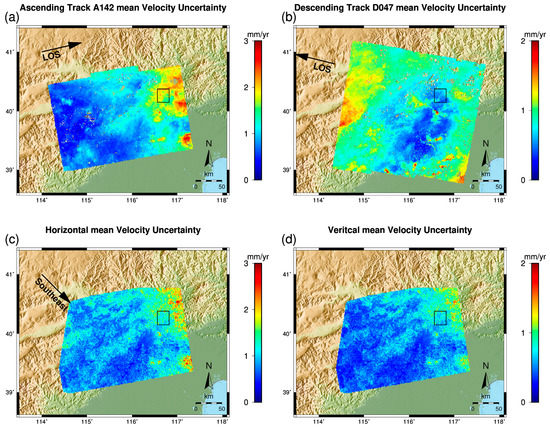 Uncertainties of the InSAR data results. (a,b) Uncertainties of the InSAR A142 and D047 mean LOS velocities. (c,d) Uncertainties of the horizontal and vertical mean velocities. Black rectangle marks the HGRS region.