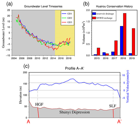 Synthetic analysis of geodetic and hydraulic data. (a) The long-term groundwater level observation time series in the HGRS region at sites GD01, GD02, and GD03 from year 2005 to 2018. (b) The water conservation history of the HGRS region from Li et al. [4]. Blue and red bars are for the reservoir drainage and recharge water volumes from SNWD each year, respectively. (c) The InSAR-determined vertical velocity and elevation along the A-A’ profile shown in Figure 10. The Shunyi Depression is produced by normal faulting of the HGF and SLF.