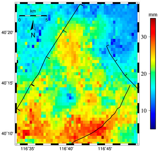 Following the method described in Section 4.2, we integrated the GPS and InSAR data to derive the mean horizontal and vertical velocities in the Beijing area during 2015–2019 respectively (Figure 7c,d). The mean horizontal velocity field is in general consistent with the tectonic deformation and the horizontal GPS velocity results (Figure S3). However, when decomposing the LOS observations into the horizontal and vertical displacements, the errors of the two components are correlated, and the error of one component is associated with the error of the other component. Due to severe land subsidence in Beijing area, the error of vertical displacement is large due to its nonlinear behavior, and the horizontal deformation estimation is thus contaminated by the correlated error with the vertical velocity component, making it hard to precisely determine the horizontal velocity field from the LOS data, and the subtle velocity gradient across the ZBFZ [42] is, therefore, not clearly visible in Figure 7c.