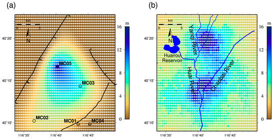 A further improvement of the estimation of storativity is to take into account deformation due to mass loading of the water storage change in both the unconfined and confined aquifers, corresponding to the terms and in Equation (7). The calculation of mass loading was performed assuming the deformation of an elastic continuum, with water storage change in the unconfined and confined aquifers as the loading source, and the porosity of the unconfined layer [47]. The mass loading in the unconfined aquifer is , where is the surface area of the aquifer within our study area, and is the spatial distribution of the water level change for the unconfined aquifer interpolated from the well observations. The mass loading in the confined aquifer is , and were interpolated from the confined aquifer results. The deformation caused by mass loading of the recharged water is , calculated using a rectangular load in a homogeneous elastic half-space [45]. Since also appears in the confined aquifer loading calculation, the estimation of needs to be carried out iteratively. Using the surface vertical deformation derived from InSAR data (Figure 14), the initial value of storativity is taken as and the initial value of the pore pressure change in the confined is taken as , which were used to derive , and was determined using Equation (7). Then, the updated and were used to calculate , and the computation was iterated until the solution converged. The final estimates of storativity range from to (Table S2). The unconfined water level change was estimated by carrying out kriging interpolation of unconfined water level observations (MC01-MC05) and a priori information about tectonic settings (Figure 15a). The confined water level change was predicted with the estimation of (Figure 15b). The estimation of is shown in Figure 16, which also indicates that the spatial distribution of storativity correlates well overall with the thickness of the quaternary sedimentary layer.