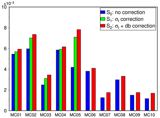 Comparing the aquifer storativity estimates under three situations, we can estimate the influence of the recharged water in the unconfined aquifer quantitively. The storativity estimates in the three situations for wells MC01 to MC10 are shown in Figure 17. The corrections for different wells vary significantly, which are almost negligible for well MC04 but almost as large as the original for well MC05. On average, there is a 23% increase from storativity to and a 28% increase from and but only a 7% increase from and . This result shows that the contribution of the water storage change in the unconfined aquifer to the effective stress is not negligible; however, the deformation due to the mass loading of the recharged water is a small contribution to the surface deformation. By comparison of the estimated storativity for all the situations, the estimated storativity, by only considering the pore pressure change in the confined aquifer and ignoring the deformation caused by the recharged water mass loading, gives the lower bound of the storativity. To estimate the aquifer storativity by including the effect of water in the unconfined aquifer, it would require a good observation of the water levels in the unconfined aquifer, which is not always available. However, if there are only good observations of the water level in the confined aquifer, the integration of the surface deformation and water level data can still give a good estimation of the lower bound of the storativity of the confined aquifer. The estimated storativity is important for water resource management and can be used to monitor water level/storage change only based on the surface deformation [12,13].