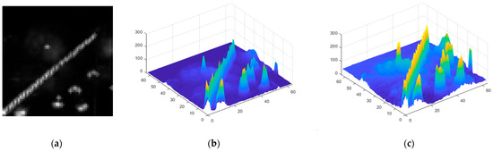 In this study, the ACE method was used to enhance the intensity image of Gm-APD, and the 3D visualization of the enhanced image was compared with the other two image enhancement algorithms, as shown in Figure 4. Figure 4a is the original two-dimensional intensity image. Figure 4b is the 3D visualization of the original 2D intensity image. Figure 4c is the 3D visualization result of the enhanced image using the ACE method. Figure 4d is a 3D visualization of the enhanced image using the contrast-limited adaptive histogram equalization (CLAHE) method. Figure 4e is a 3D visualization of the enhanced image using a linear transformation method. It can be seen from the figure that the CLAHE method cannot effectively enhance the object. Although the linear variation method enhances the object, the background is also enhanced. The ACE method used in this study cannot only effectively enhance the object, but also adjust the local gain for the background area, which is less enhanced than the intensity value of the object.