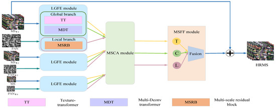 The overall framework of the proposed method is shown in Figure 1 and consists of three main modules: the LGFE module, MSCA module and MSFF module. The LGFE module is composed of two components: a global feature extraction module consisting of a texture-transformer for learning global texture information and a Multi-Dconv transformer for acquiring the spatial information from each image band across channels, and a local feature extraction module consisting of multi-scale residual blocks.