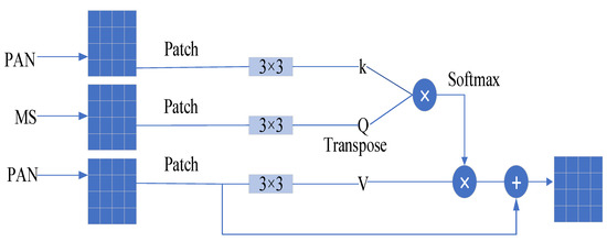 Since the texture-transformer is mainly used to learn similar texture information from the two images [33] to be used to better obtain global spatial information, we use different inputs as shown in Figure 2. Specifically, we first segment the PAN and MS images into non-overlapping patches of the same size, and encode their positions to form the corresponding images patches sequence with . The image patches are used as the texture features to be input, meanwhile, the features are extracted using convolution and projected into the three components necessary for the corresponding transformer, namely: (query), (key), and (value), respectively. The mathematical expressions are as follows: