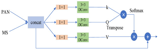 As shown in Figure 3, in order to fully acquire the features of the PAN and MS images, we choose to jointly input both into the module. First, we use point convolution of to obtain contextual information between different channels at the pixel level, and subsequently use depth convolution to obtain spatial context along the channel direction. Subsequently, we map the contextual information learned from the depth-separable convolution to , and as follows:
