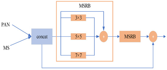 Since pansharpening as the task of transforming low resolution to high resolution, the final output is a high-resolution MS images. Remote sensing images also have scale effects, i.e., different scales contain different feature information. Therefore, for the fusion process of multi-scale multi-features, we focus on maintaining the high-resolution feature representation. Inspired by HRNet [35], we design the MSCA module to aggregate the same type of features at different scales.
