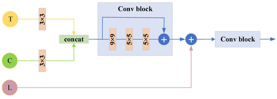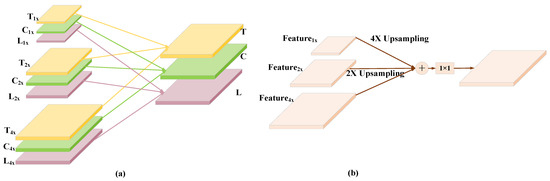 The overall construction of the MSCA is shown in Figure 5a, where we aggregate different scales of the same type of features to the highest resolution level by the up-sampling operation, use convolution to mix the semantic and feature details of the different scales, and finally obtain three different types of high variability feature maps containing rich contextual information. In this case, the high-resolution mapping of a single kind of information is shown in Figure 5b, where three different scales of the same kind of features are mapped to the highest resolution size by upsampling operations for a superposition operation, followed by information aggregation using convolution.The specific operation flow of MSCA is shown in the following: