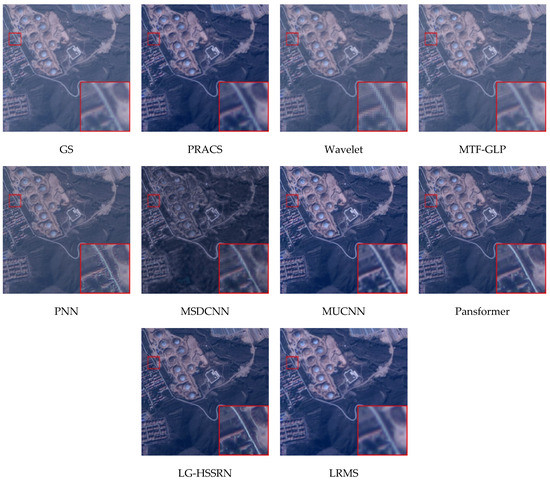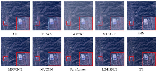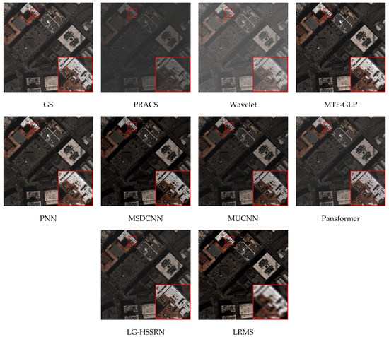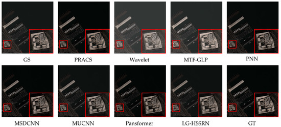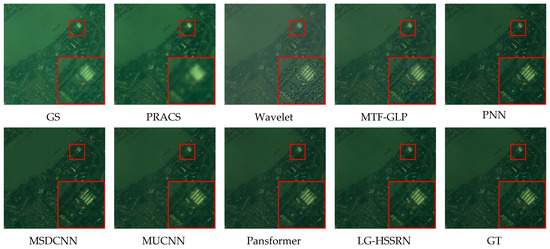 Figure 11 and Figure 12 show the visualization results and residual plots, respectively, of the corresponding methods on the QuickBird dataset. Both CS- and MRA-based methods show significant spatial and spectral distortions, and the residual plots of these methods also exhibit significant errors with the GT images. From the PNN, MSDCNN, and MUCNN fusion results, it is seen that the colors of the red houses are too light compared to the GT images and show some degree of spectral distortion. In addition, some artifacts can be observed in the results of the Pansformer method. In contrast, the LG-HSSRN is closest to the GT image, and it can also be observed that there are no obvious bright spots in the error map, which means that our method has the best fusion effect.
