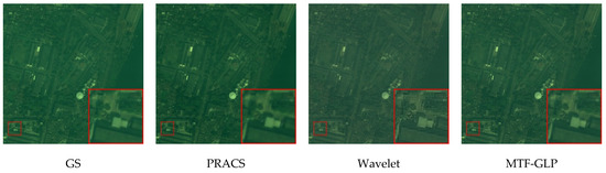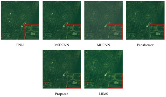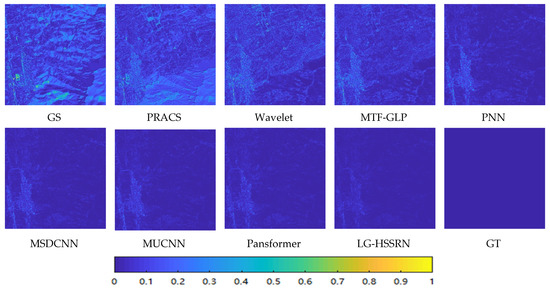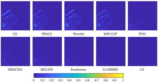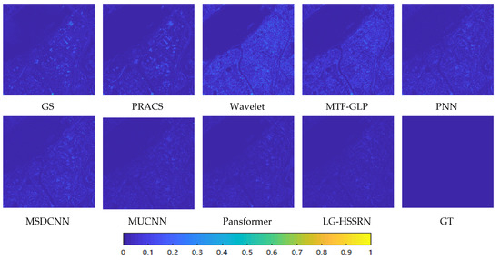 Figure 9 and Figure 10 show the pseudo-color maps and the difference maps, respectively, of different methods on the GaoFen-2 dataset. It is clearly seen that GS and PRACS have obvious color blurring, and the spatial and color distortion of buildings in the images appear obvious. The spatial structure of the overall image of MTF-GLP and Wavelet is destroyed, and obvious spatial blurring appears. The PNN mitigates the spatial distortion, but obvious spectral distortion appears, and the red roof color degree is too light. The MSDCNN, MUCNN and Pansformer are closer in spatial structure and spectral retention, but still show some spatial blurring phenomenon.