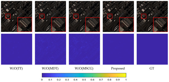 Figure 16 shows the corresponding visual comparison plots. It can be seen that after removing the Multi-Dconv transformer and the MSCA module respectively, the red buildings in the local zoomed image appear lighter in color and the overall error increases. This also reflects the importance of several components from the side.