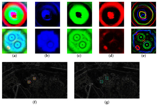 We find that, unlike natural images, adversarial patches usually require strong color channel information or contain enough high-frequency noise information to make them effective for attack. As shown in Figure 2, different from natural images, the adversarial patch can successfully attack in the physical domain, so it shows regional color transition. Figure 2e shows the gradient image of the regional color transition. The transition from a colored area to a colorless area will be displayed as colored lines. This feature is not available in natural images, and such strong color transitions are difficult to come by in a natural environment. In Figure 2f,g, the white lines in the gradient image are the gradient of the actual environment, which is caused by the unobvious separation of RGB channels. The regional color transition is caused by the introduction of the loss. If the loss is not introduced, the adversarial patch will degenerate into a noise patch, and the noise patch will fail to attack due to the loss of noise information under remote sensing detection. This feature allows the adversarial patch to have greater gradient information in the color transition region when they are transformed into the gradient domain. The RGB channels of the gradient map of the adversarial patch do not interfere with each other, while the natural images are different. Such strong gradient information of the adversarial patch will become more significant when normalizing the image, while the salience of the background will be further suppressed. Therefore, we locate the adversarial patch using this feature.