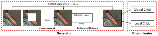 The coarse prediction network is trained with reconstruction loss, while the fine network is jointly trained with reconstruction loss and GAN loss. The fine network can learn better texture and detail features, which is more conducive to image inpainting. The structure is shown in Figure 6.
