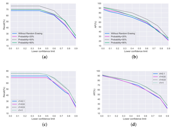 (a,b) Recall and AP of the model under different Random Erasing enabled probabilities; (c,d) Recall and AP of model under different Random Erasing aspect ratio ranges.
