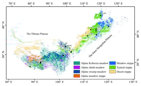 Spatial distribution of alpine and temperate grasslands in China []. Black triangles denote the 18 flux sites.
