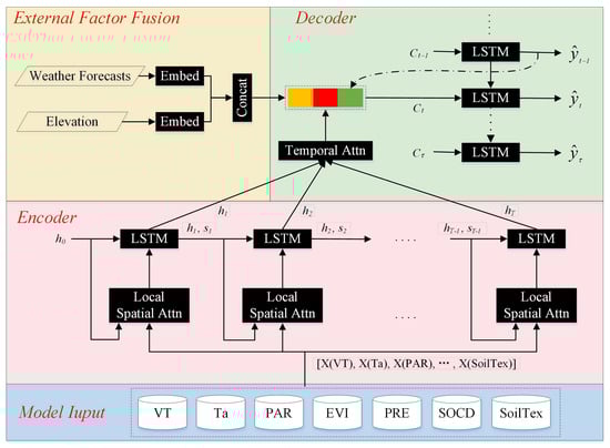 In this study, we used a deep learning model including a multi-level attention mechanism, known as Geoman. It was originally developed to perform geographic sensor time-series predictions, such as for air quality and water quality []. The structure was modified from the original Geoman framework and is shown in Figure 2. Geoman combines the advantages of the attention mechanism and LSTM by distinguishing the importance of multiple time-series data to preserve key spatiotemporal information. The attention module in Geoman consists of spatial and temporal attention. The spatial attention includes two sub-modules, namely global spatial attention that expresses the inter-site correlations, and local spatial attention that expresses the intra-site correlations. The temporal attention in the decoder stage captures the time dependencies. LSTM learns interactions at multiple timescales and can be extended to encoder and decoder modules []. Limited by the availability of ecological data, and also by differences in the spatial density between ecological observation sites and other geographic monitoring sites, including loop detector systems and urban groundwater monitoring systems, we only used local spatial attention to describe the dynamic correlation between each local feature and the target series. For simplicity, in this paper the term ‘Geoman’ refers to the model without global spatial attention. The local spatial attention mechanism can be expressed simply by Equations (2) and (3).