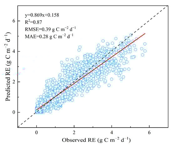 According to the results of the 10-fold cross-validation, the predicted RE was in line with the observed RE (Figure 3). Most of the scattered points occurred approximately at the 1:1 line (R2 = 0.87, RMSE = 0.39 g C m−2 d−1, MAE = 0.28 g C m−2 d−1), indicating that Geoman can accurately estimate the RE value for northern China’s grasslands.