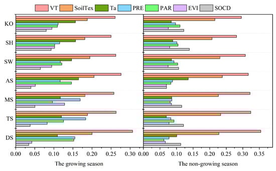 Relative importance of the environmental variables for predicting RE in the growing season (left) and non-growing season (right). KO: alpine Kobresia meadow. SH: alpine shrub meadow. SW: alpine swamp meadow. AS: alpine meadow steppe. MS: meadow steppe. TS: typical steppe. DS: desert steppe.