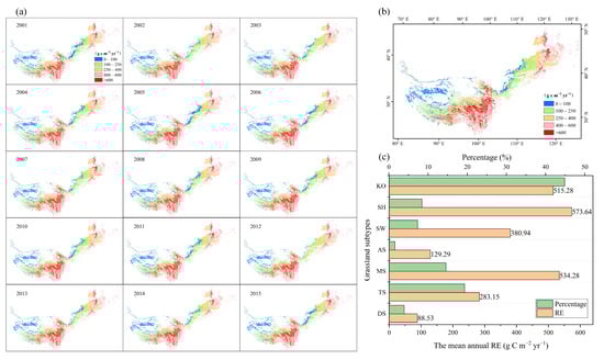 (a) Spatial distribution for RE in northern China’s grasslands from 2001 to 2015; (b) the mean annual RE for grassland in northern China; (c) Mean annual RE magnitudes for the seven grassland subtypes and the area weighted percentages to total RE.