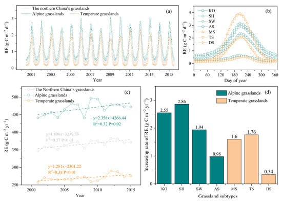 (a) Seasonal dynamics of RE at the regional scale from 2001–2015; (b) seasonal dynamics of mean 15-year seasonal RE in the seven grassland subtypes; (c) interannual dynamics of RE at the regional scale from 2001–2015; (d) the increasing rate of RE of the seven grassland subtypes.